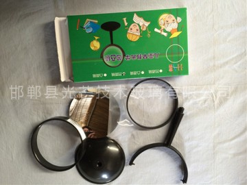 帶底座凹透鏡 直徑:10厘米 焦距:負(fù)300mm 幼兒園小朋友 或者中小學(xué)生認(rèn)識(shí)凹透鏡的特點(diǎn) 學(xué)習(xí)凹透鏡光學(xué)原理的的器材 尺寸大也時(shí)候教師教學(xué)演示用教具 知識(shí)拓展閱讀: 凸透鏡與凹透鏡可以從以下幾個(gè)方面加以區(qū)別:外形特征、對(duì)光線的作用、成像特點(diǎn)及用途等。具體方法如下: 方法一:用手摸,鏡子的中央部分比邊緣厚的是凸透鏡,鏡子的中央部分比邊緣薄的是凹透鏡。 方法二:隔著鏡子觀察距鏡子較近的書(shū)上的字,有放大作用的是凸透鏡;字變小的是凹透鏡。 方法三:隔著鏡子觀察距鏡子較近的書(shū)上的字,移動(dòng)鏡子,若發(fā)現(xiàn)像的移動(dòng)方向總是與鏡子的移動(dòng)方向相同,則該鏡子是凹透鏡;若發(fā)現(xiàn)像的移動(dòng)方向總是與鏡子的移動(dòng)方向相反,則該鏡子是凸透鏡。 方法四:隔著鏡子觀察窗外的物體,若能看到上下左右都顛倒的像,這種鏡子是凸透鏡;若看到像是正立的,這種鏡子是凹透鏡。 方法五:將點(diǎn)燃的蠟燭放在離透鏡適當(dāng)距離處,在另一側(cè)光屏上能得到倒立實(shí)像的是凸透鏡;無(wú)論怎樣調(diào)節(jié),在另一側(cè)光屏上不能得到像的是凹透鏡。 方法六:讓鏡子正對(duì)太陽(yáng)光照射,在鏡子的另一側(cè)放一張與透鏡平行的白色卡片紙,耐心調(diào)節(jié)鏡子與紙之間的距離,能得到一個(gè)小亮點(diǎn)的是凸透鏡;始終不能獲得小亮點(diǎn)的是凹透鏡。 方法七:觀察陽(yáng)光通過(guò)了兩副眼鏡在地面上形成的光斑,若形成光斑的中間比四周明亮,則鏡子是凸透鏡;若形成光斑的中間比四周暗,則鏡子是凹透鏡。 方法八:近視眼鏡,是用凹透鏡做成的。老花鏡,是用凸透鏡做成的。 說(shuō)明:辨別凸透鏡與凹透鏡有好多方法,哪種方法好,要視具體情況而定。例如,如果待辨別透鏡的中央與邊緣的厚薄差異不明顯,就不能用“摸”的方法(況且精密光學(xué)儀器是不允許直接用手去摸的);在有太陽(yáng)光與沒(méi)有太陽(yáng)光的場(chǎng)合,所選的方法也不同??傊?,一種好方法,應(yīng)該簡(jiǎn)便、易行、有效。它是隨場(chǎng)合變化而變化的,不宜一概而論。 技巧:當(dāng)你想要判別兩件事物的相同和不同之處時(shí),就需要用比較與對(duì)比的方法。比較就是找出事物的相似性,即共同特征。對(duì)比是找出事物的不同點(diǎn)。用這種方法來(lái)分析事物,能幫助你發(fā)現(xiàn)一些平時(shí)容易忽略的細(xì)節(jié)。